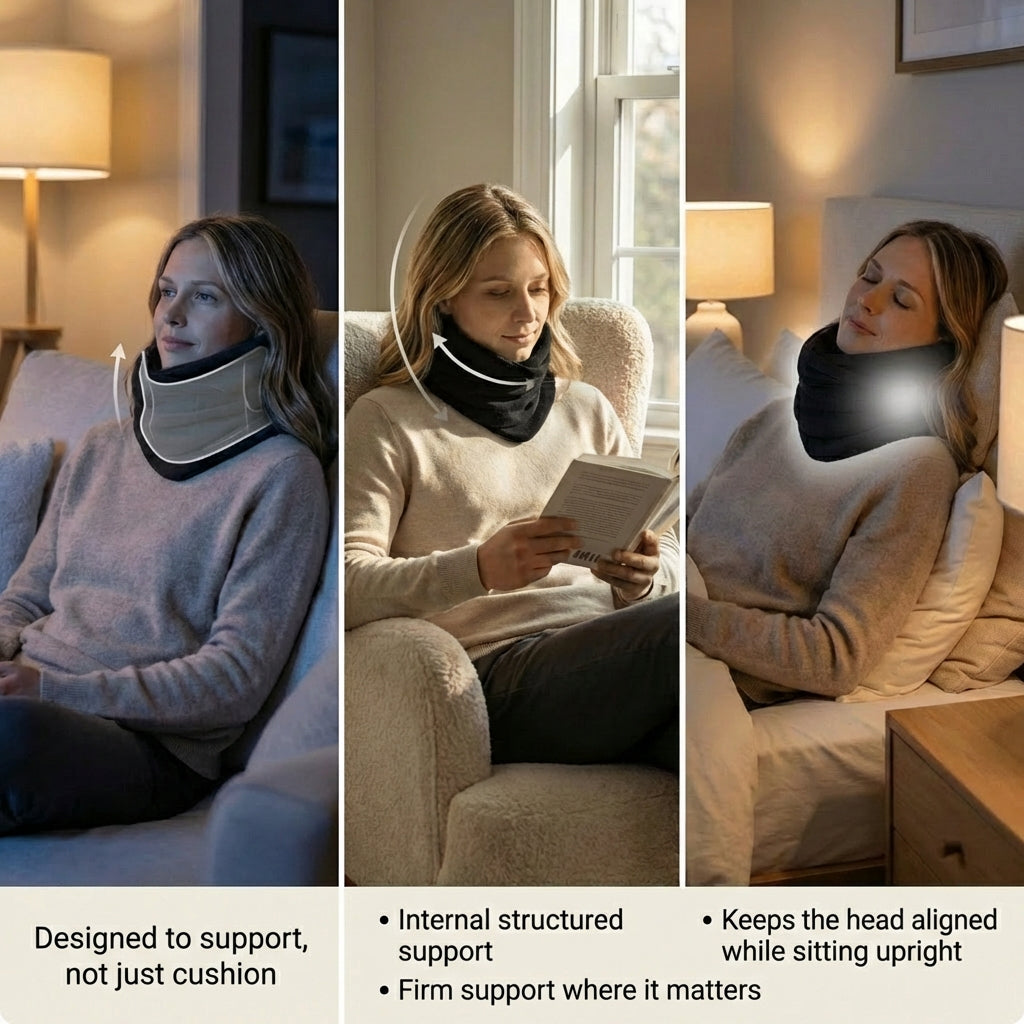 CALMERA supports your neck (not just cushions it). The internal structure keeps your head aligned so it doesn’t fall forward or to the side — no more constant adjusting.